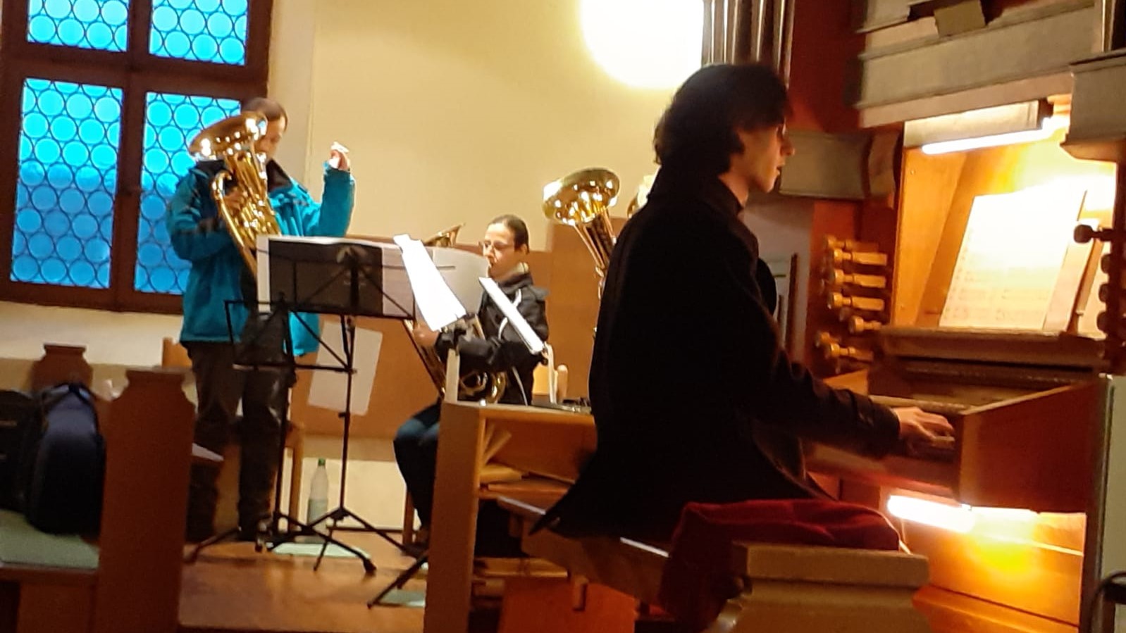 Wir musizieren gerne gemeinsam mit anderen. Hier zum Beispiel mit Jonathan Fiegl, mit dem wir für den Altjahresabend 2019 verschiedene doppelchörige Werke einstudiert haben. -